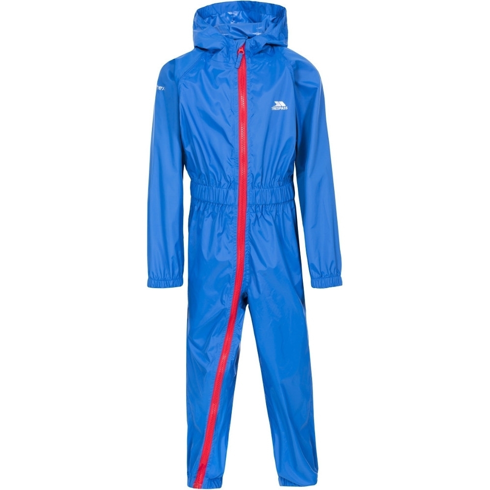The boys Button II rain suit from Trespass is a brilliant piece for splashing about in the park or garden on rainy winter days. Fully waterproof with taped seams and a grown on hood it’s great for kicking puddles in., Waterproof 2000mm., Breathable 3000mvp., Windproof., Taped seams., Grown on hood.