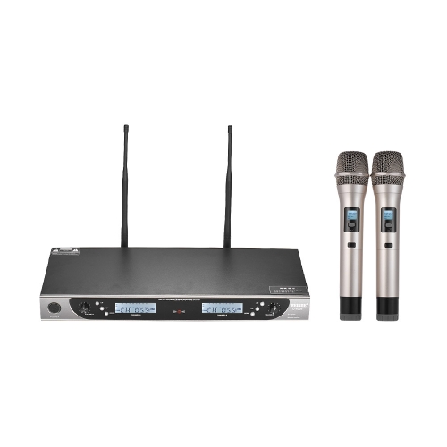 Features: This wireless microphone system is including 2 handheld mics and 1 receiver with dual LCD display. Using UHF band frequency 620-690MHz, switchable 50 channels per microphone, 100 channels in total. Adopts infrared automatic synchronizing technology for quick and easy connection of microphone and receiver. The receiver with 2 control knobs for adjusting the volume of the microphone separately. With two XLR balanced and one 1/4 audio mix unbalanced output interfaces.