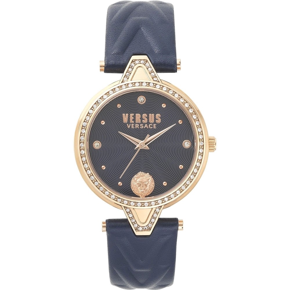 Versus Versace SPCI34-0017 Women’s V-Versus Wristwatch Guarantee – 2 year Case width – Approx – 34 mm Case depth Approx – 10.2 mm Gender – Ladies Dial Colour – Dark Blue Case Material -Rose Gold Tone Stainless Steel Strap type – Genuine Leather Strap colour – Dark Blue Water resistance – 30 metres Movement – Quartz (battery)Versus Versace watch features a dark blue leather strap and a stone set rose gold tone stainless steel case. It has a rose gold tone dial with three hand movement and the versus lion head motif at the 6 o’clock position