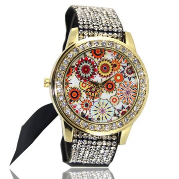 Trendy Women’s Colorful Flower Rhinestones Ribbon Wrist Watch Adjustable