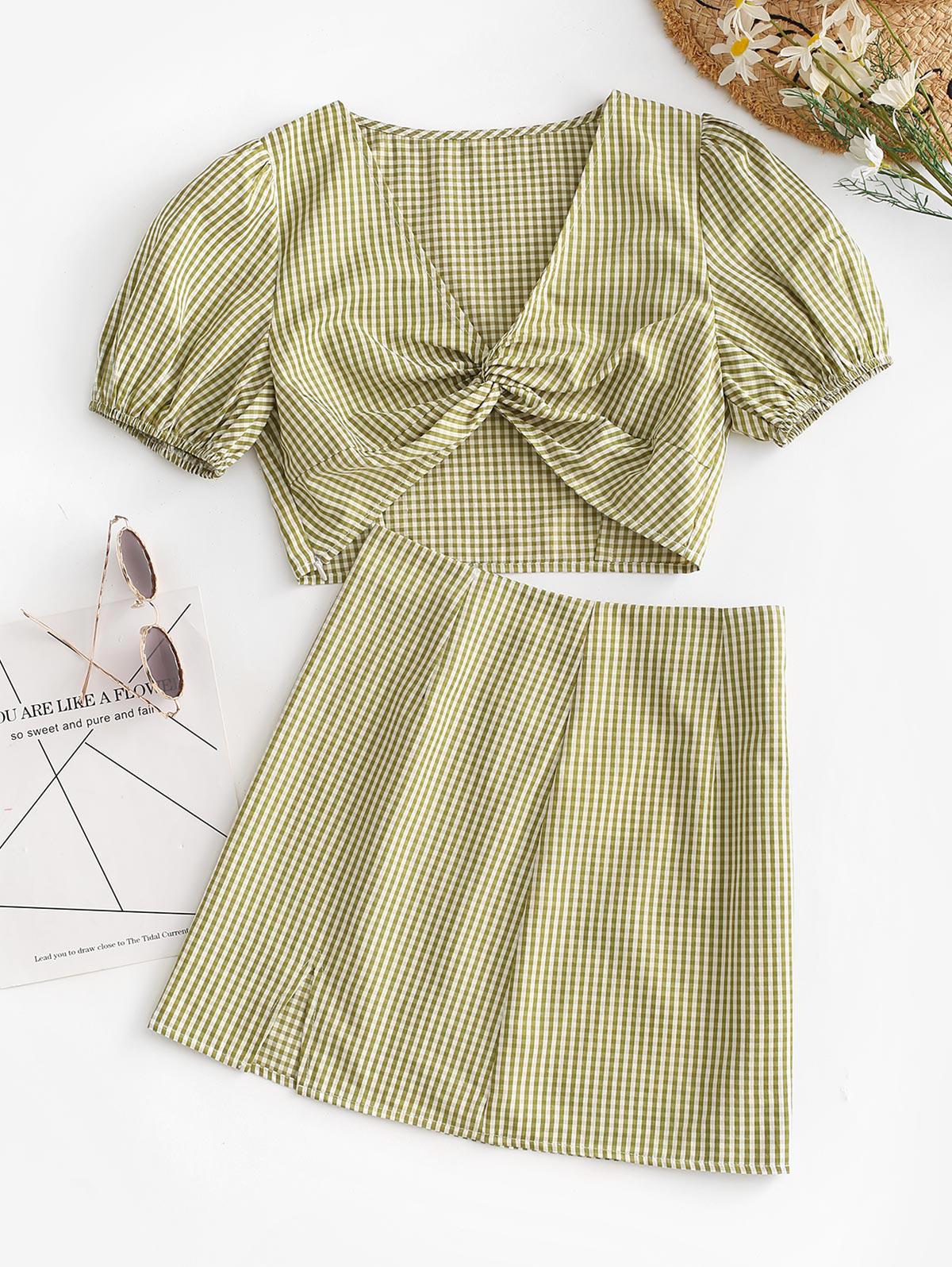 ZAFUL Gingham Puff Sleeve Front Twist Two Piece Skirt Set S Light green