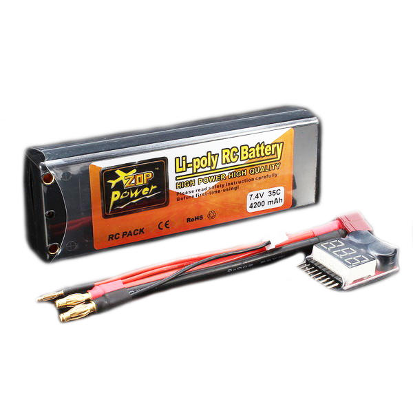 ZOP Power 7.4V 4200mAh 2S 35C Lipo Battery T PlugWith Battery AlarmDescription:Brand: ZOP PowerName: 7.4V 4200mAh 2S 35C Lipo BatteryCapacity: 4200mAhSize: 138*46*24 mmDischarge Rate: 35C Weight: Approx 210gColors: Standard ColorsNote: due to the difference between the measurement, the battery dimension and weight may have little error.Caution:Dont over-charge, or over-discharge batteries.Dont put it beside the high temperature condition.Dont throw it into fire.Dont throw it into water.Package Included:1 xZOP Power 7.4V 4200mAh 2S 35C Lipo Battery T Plug1 x Battery Buzzer Alarm